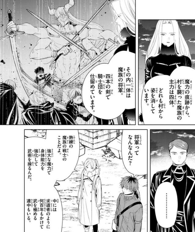 夕食を終えてフリーレン達は探索に出発しようとしますが、その前に情報共有を行います。村を襲った魔族の主力は4体いて、そのうちの一体は四本の剣で騎士団を仕留めた魔族の将軍だとメトーデは皆に話します。将軍とは熟練の魔族の戦士の事で、強力な魔力で身体能力を強化して武術を操ります。中には求道者のように何百年もかけて部を極めたような連中もいて、魔王軍にはアイゼンよりずっと強い将軍もいたようです。今回の魔族も人の姿とは掛け離れている可能性が高いようで、フリーレンは剣四本持った剣術の達人と戦った経験はなく、それが騎士団が負けた原因だろうから、シュタルクにも注意するように言います。