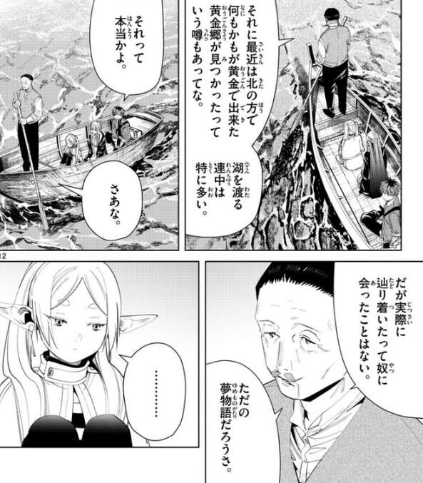船頭に伝記がある打ち捨てられた修道院がある島まで送って行ってもらいますが、その途中で船団に遭遇します。湖に船団がいることにシュタルクが驚いていると、この時期は人や物資の行き来が盛んになるから、と船頭がシュタルク達に説明します。さらに、最近は北の方で何もかもが黄金で出来た黄金郷が見つかった、と黄金郷の噂が出ている事も船頭はシュタルク達に話します。シュタルクは、それって本当かよ、と黄金郷の噂を疑うと、船頭も実際に辿り着いた奴に会ったことはない、と言いただの夢物語だと言います。