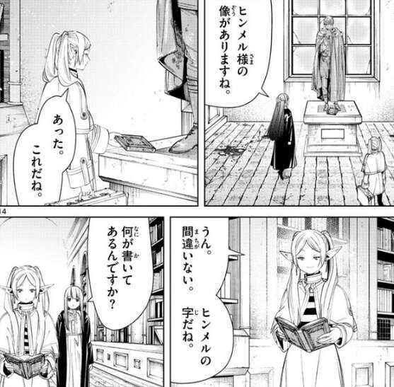 そんな話をしていると打ち捨てられた修道院がある島に到着し、フリーレンが修道院にかかっている結界を解いて、早速内部を探検します。すると大きな書庫のある部屋にヒンメルの像があり、すぐそばに伝記が置いてありました。