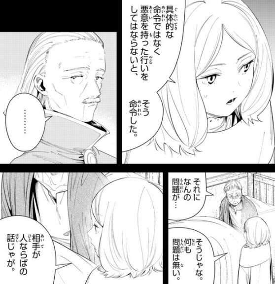 具体的な命令でなく悪意を持った行いをしてはならない、と領主が命令したことにエーデルは違和感を覚えます。老人はそれになんの問題が…、と言いますが、何の問題もない、相手が人ならばの話じゃが、と含みのある返事をします。