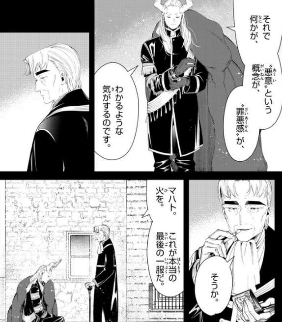 この頃になるとグリュックも年を取ってしまい、立ち上がる時にマハトが手を貸すようになっていました。グリュックはマハトと過ごした時間を振り返り、魔族のマハトにとっては一瞬の出来事に過ぎなかったのだろうな、とマハトに言います。マハトは、たとえ一瞬であったとしても貴方と出会い過ごした時間は、私にとって掛けがえのないものだと考えております、と答えますが、グリュックはそんなマハトに気持ちが悪いな、とつぶやきます。しかし、グリュックはそんなマハトをとてもいい悪友だったとも言いますが、だから、その全てをぶち壊そうと考えました、とマハトは言うと足元の地面を黄金に変え始めます。