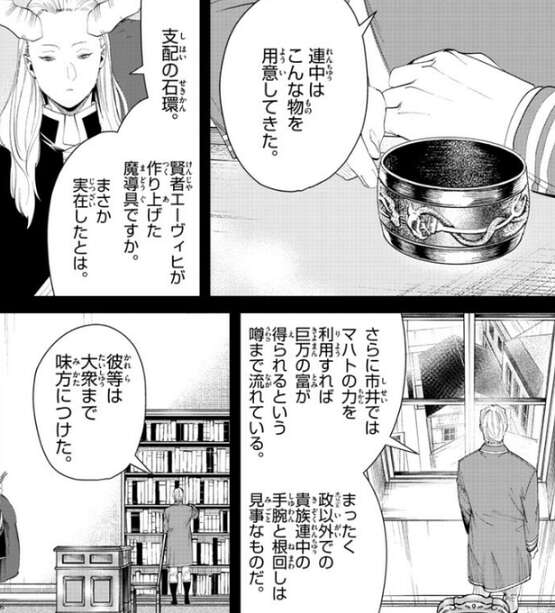 グリュックは、この貴族達の要求を最高に笑えると言い、奴等は魔族の事を微塵もわかっていない、と嘲笑します。そして、さあ、マハト、どうする?これを着ければヴァイゼの民に“悪意”を抱いた瞬間に君は死ぬことになる、とマハトに聞きますが、マハトは自分に“悪意”という感情が無いと分かっているので、地獄の底まで付き合ってくれるのですよね、とグリュックに答え貴族の要求に全て従います。