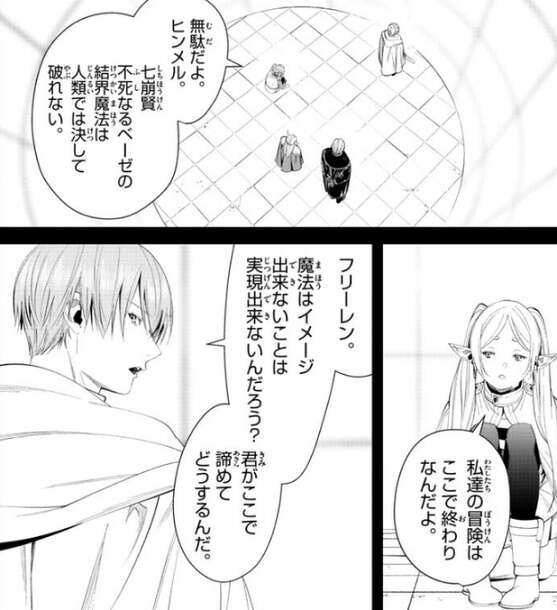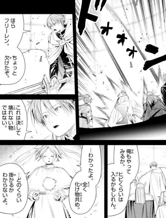 それでもフリーレンは、私はダイヤを握り潰せるような化け物じゃないんだ、ベーゼと私の間にはそれほどの差がある、と言い、不死なるベーゼの結界魔法は打ち破れない、と諦めたままです。するとヒンメルは、だったら僕がイメージさせてやる、この世に不可能はないって、と言うと剣を構え、結界魔法を剣で壊そうとします。