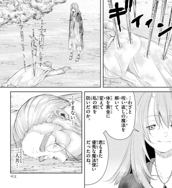 しかしデンケンは黄金に変えられてしまい、何もできなくなってしまいます。さらに遠く離れた場所では、フリーレンと避難していた集落の人々が黄金に変えられてしまっています。