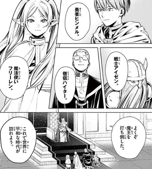 勇者ヒンメル、戦士アイゼン、僧侶ハイター、魔法使いフリーレンの勇者一行は魔王を倒し王様に報告しています。王様が広場に勇者一行の彫像を作ってくれるそうで、広場で酒や食べ物を楽しみながらこれまでの10年の冒険を振り返っています。