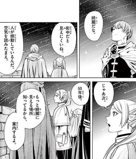 50年に一度の流星群、エーラ流星を四人で眺めながら、平和な時代の幕開けには丁度いいな、とヒンメルは呟きます。フリーレンはエーラ流星がもっと綺麗に見える場所を知っているから案内するよ、と言い50年後に再び流星群を見よう、と皆で約束をします。