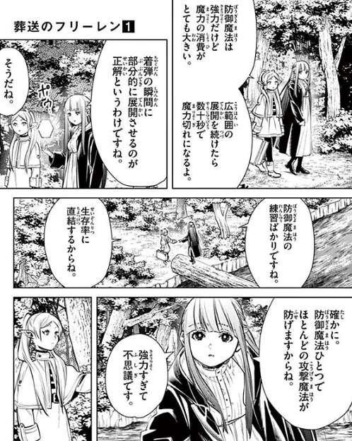 勇者ヒンメルの死から27年後、中央諸国、グレーセ森林でフリーレンはフェルンの防御魔法の修行をしています。フリーレンは防御の隙を狙って、魔法の弾道を変えて背中に魔法を当てます。魔法を防ぐことが出来なかったフェルン、どう対処する?とフリーレンから聞かれて、今度は防御魔法を自分の周囲に展開して防ぎます。しかし、修行が終わる頃には、フェルンは魔力の消費のし過ぎで魔力切れの状態になってしまいます。
