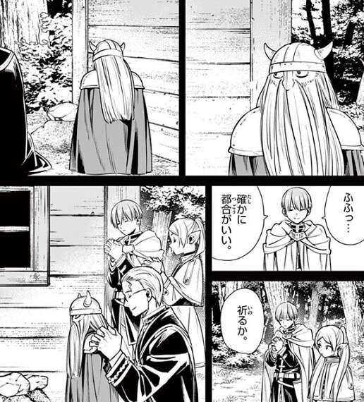 勇者ヒンメル達がまだ旅をしていた頃、アイゼンの家族が眠る墓を訪れた一行、ハイターは昔、アイゼンの村が魔族に襲われたと知り、墓の前で祈りを捧げます。人は死んだら無に還ると言うアイゼンに、天国に行くんですよ、とハイターは言います。そこからヒンメル達は、天国は存在するか、存在しないかと言う話になり最後はアイゼンの家族が眠る墓に全員で祈りを捧げます。