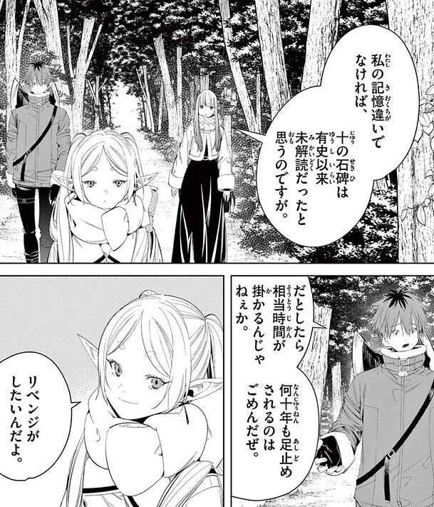 そしてフランメの作ったゴーレム、天脈竜のエピソードを挟んで、新しい長編シリーズが始まります。フリーレンは昔、詳しく調べられなかった女神の石碑を解析しようとしますが、約80年前の過去に飛ばされてしまいます。そこでフリーレンは、過去の勇者ヒンメル一行と再会します。フリーレンは無事に過去に帰還することが出来るでしょうか?歴史が変わるなど、面倒くさい事にならなければいいのですが…。