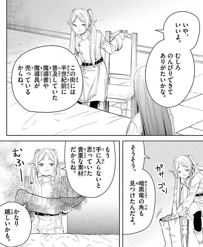 マハトとの戦いは終わり、相討ちで瀕死の重傷を負っていたデンケンですがヴァイゼの教会で手当てしてもらい一命をとりとめていました。フリーレンは傷も癒えていて、シュタルクも体調が良いようで既にスクワットが出来るようになっています。しかし、シュタルクの相変わらずの頑強さと回復力にフリーレンとフェルンは引いていて、シュタルクの化け物のような体の頑強さをひそひそと話をしています。フリーレンはフェルンの傷が完治するまで、ヴァイゼの街で魔導書や魔道具の買い物を楽しむことにします。