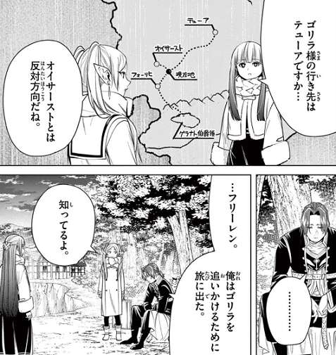 勇者ヒンメルの死から29年後、北側諸国、ローア街道で、10年前に旅に出た親友の行方をザインは聞いて回っています。今までも目撃情報があり北の方にいるようですが、10年前だろ、よく目撃情報が残っているな、とシュタルクが言うと、名前が特徴的だとザインは言い名前を聞くと、戦士ゴリラだと言います。村でそう呼ばせていたそうで、ザインは僧侶アゴヒゲと呼ばれていたそうです。