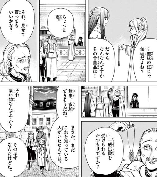 勇者ヒンメルの死から29年後、北側諸国最大の魔法都市、オイサーストまであと少しのところにフリーレン達はいます。オイサーストで一級魔法使いの資格を取れば、北部高原に入ることが出来ます。その後、大陸魔法協会 北部支部で手続きをしますが、試験は二か月後で、さらに受験資格として五級以上の魔法使いの資格が必要になると言われます。無資格で聖杖の証しか持たないフリーレンは、一級魔法使いの試験を受けるのは無理そうです。