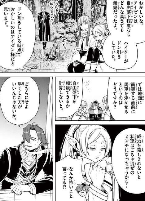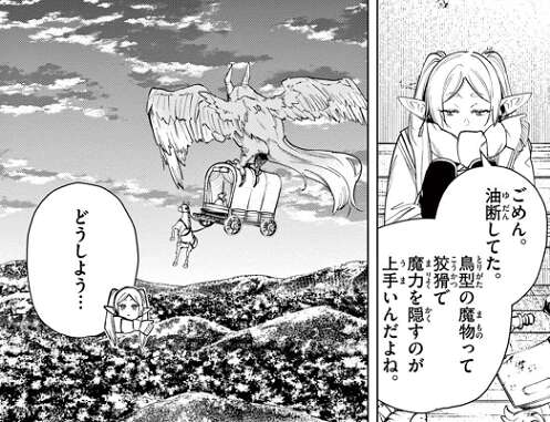 勇者ヒンメルの死から29年後、北側諸国、バンデ森林を進むフリーレン達は、商人の馬車に同乗させてもらっています。馬車の中でブレスレットや指輪の話をフリーレンとフェルンがしていると、鳥形の魔物に馬車ごと襲撃されてしまいます。