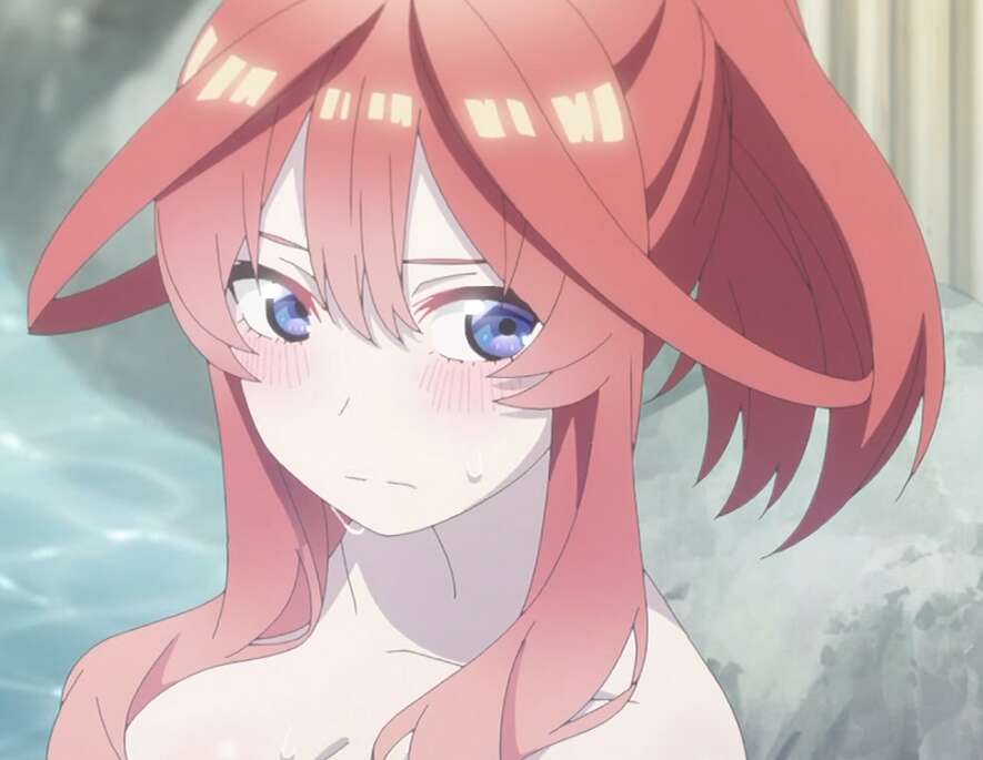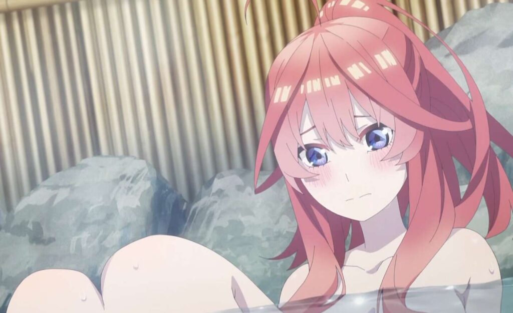 五月と話した事で、偽五月がいて四人の誰かが家庭教師を辞めさせようとしている事が分かりました。五月に変装した理由は何か風太郎が考えていると、バスタオル姿の二乃が突然温泉に現れます。