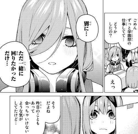 三玖は四葉に風太郎を見かけなかったか聞きますが、四葉は学園祭の仕事をしていて風太郎は見ていないようです。四葉は昨日の事もあり、会ってはいけないような気がしていたそうですが、最後の思い出作りをしておいた方がいいかもね、と意味深な発言をします。そんな話をしていると、風太郎が竹林と一緒にいるところを三玖と四葉は見つけてしまいます。