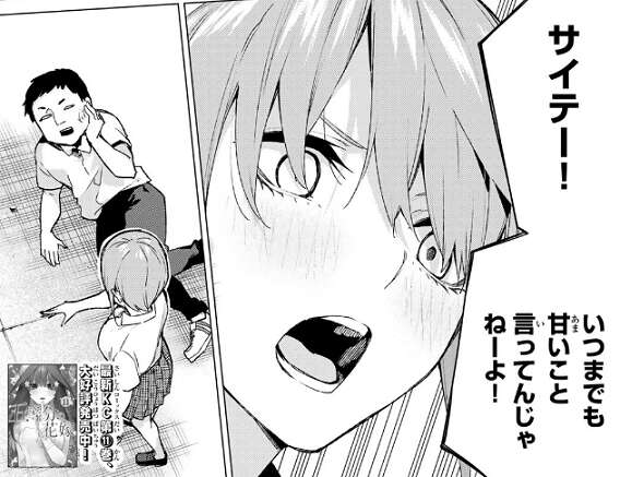 上から目線の一花に、顔を赤くしながら悔しがる風太郎です。照れちゃってと言いながらも一花は、この気持ちはまだ しばらく静まりそうにないや、と風太郎に対する好きという気持ちは静まりそうにないようです。
