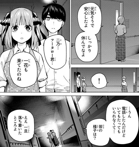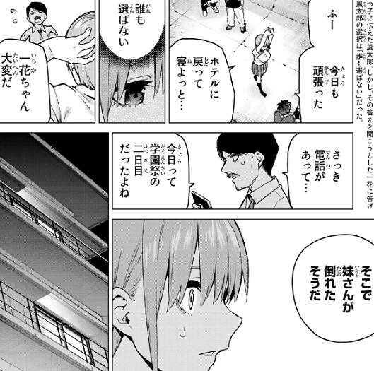 誰が倒れたのかは明らかにされませんが、倒れた誰かは元気なようで一花は少し安心します。部屋を出たところで、二乃と風太郎に会います。二人もいてもたってもいられなくて、駆けつけたようです。その後二乃は学園祭の片づけがあるようで、学校に戻り一花と風太郎が残されます。