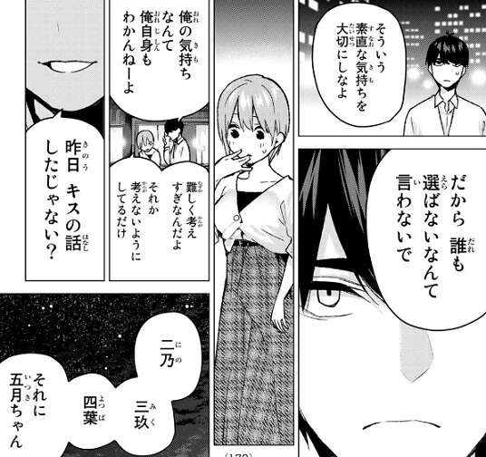 一花は風太郎に素直な気持ちを大切にして欲しいと言い、だから誰も選ばないなんて言わないで、と風太郎にお願いします。しかし風太郎は、俺の気持ちなんて俺自身もわかんねーよと言い、有耶無耶にします。