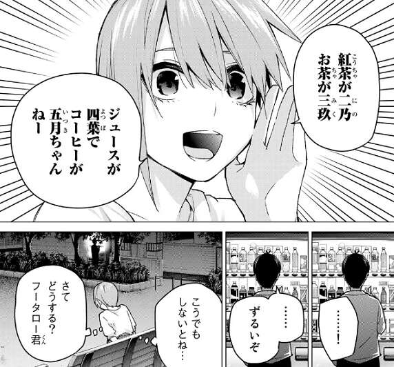 一花は話題を変えて、昨日のキスの話をし始め五つ子の誰にキスをされたら嬉しいかと風太郎に質問します。そして、自販機で好きな飲み物を買ってきてと言いつつ、紅茶が二乃、お茶が三玖、ジュースが四葉で、コーヒーが五月と何を選ぶかで、誰とキスしたいかを確認しようとします。