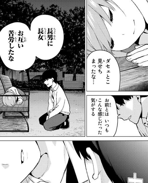 が、10分待っても風太郎は戻って来ず一花は意気地なしと怒り、そのまま眠ってしまいます。さらに5分経ちますが、風太郎は結局買わなきゃ済む話だと、何も買わずに一花のところに帰ってきます。待たせすぎて寝ている一花に、長男長女 お互い苦労したなと一花を見つめながら話しかけます。