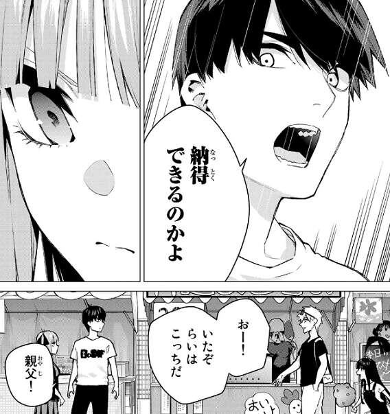 風太郎は自分の父親と五つ子たちの父親が知り合いだったことに驚きますが、二人は学生の時からの腐れ縁で、勇也はバリバリのアウトロー、マルオは不動の学年トップで生徒会長だったそうです。二乃が勇也を絶賛して、素敵と言っています。さらに二人を繋ぎ止めていた先生?もいたようで、会話の流れから五つ子たちの母親の事のようです。