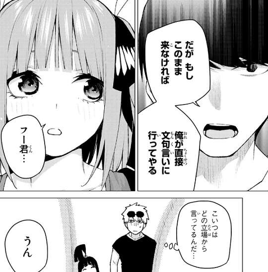 父親の勇也からこれ以上のことは、五つ子たちの父親から直接聞くように言われ、風太郎はしぶしぶ了解し、しかしこのまま来なかったら直接文句言いに行ってやると断言します。風太郎の男らしさ?に顔を赤らめていますが、その二人を見てちょっと勇也は引き気味です。