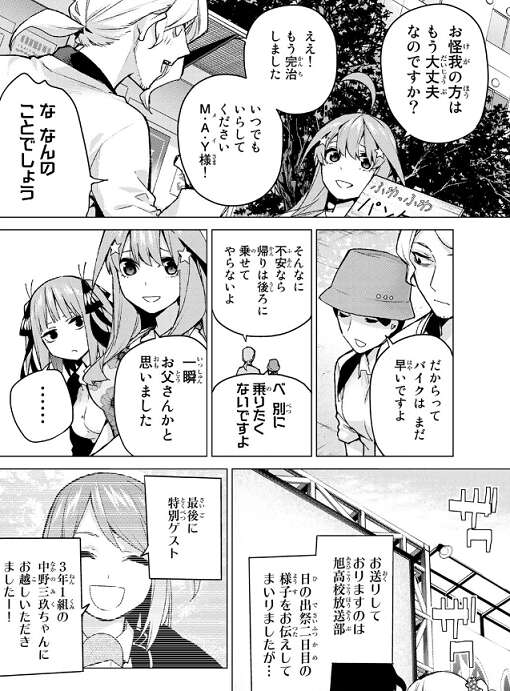 学園祭 二日目の場面になり、パンケーキ屋には初日より明らかに人が増えてきます。そして二乃と五月の元に、風太郎と二乃のバイト先の店長が訪れます。隣には三玖のバイト先の店長もいます。退院した店長に五月が挨拶すると、五月の事を「M・A・Y」様とちゃんと認識しています。