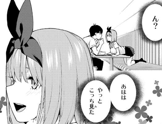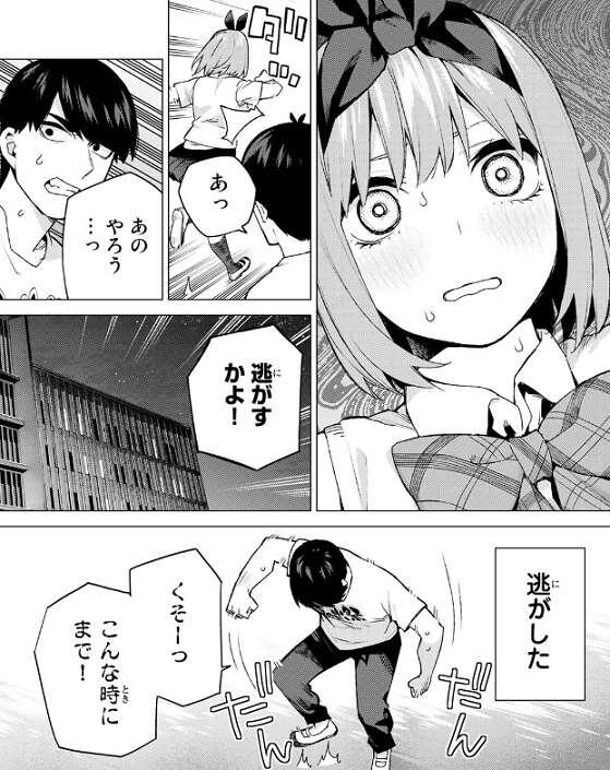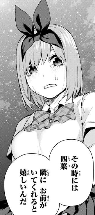 ショックを受け立ち尽くす風太郎に、光栄だが上杉さんにはもっと良い人がいるはずです、私なんかで収まっちゃもったいない!、と笑顔で言います。しかし風太郎はお前の気持ちを教えてくれと、四葉に迫ります。答えられない四葉はとっさに逃げ出してしまい、風太郎は四葉を見失ってしまいます。