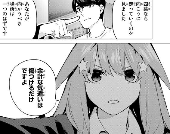 そこに五月が現れ、風太郎は最初 あいつらは…と他の四人を気遣いと五月に話しかけます。しかし五月から余計な気遣いは傷つけるだけですよ、と四葉の方に向かうように言われます。風太郎は五月に謝り、四葉が走っていった方向へ走り出します。