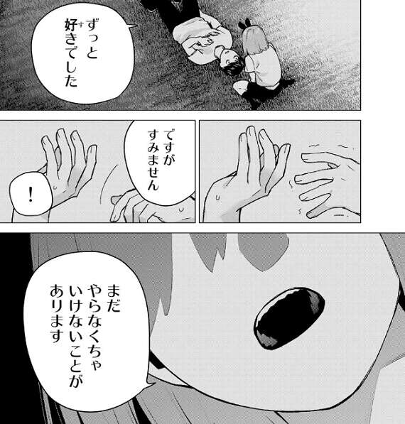 一花はマンションに戻ってきますが、いたのはリビングで勉強をしている五月だけで他の姉妹はまだ外出したままでした。五月に風太郎と四葉の二人はまだ付き合っていない事を伝えると、応援したいと言いつつも二人の関係に口を出すことは出来ないと言います。そして、皆の事を考えると素直におめでとうと言えません…、と五月は呟くように言います。