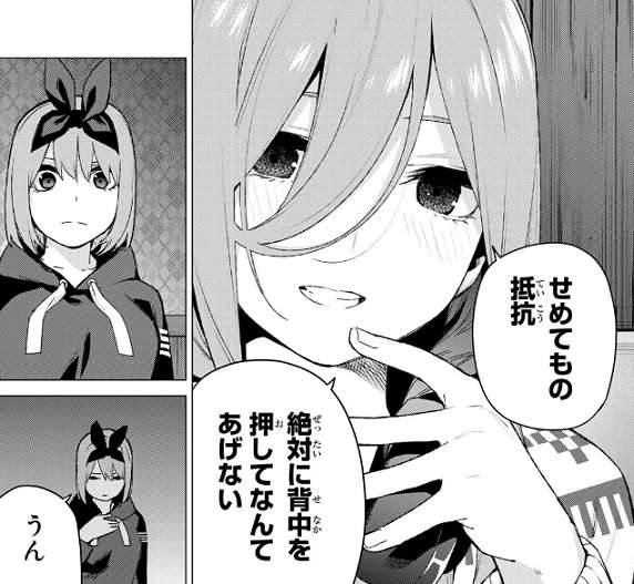 四葉は二乃の気持ちを分かってあげられてなかった…と反省し、怒られて当然だと言います。しかし、二乃は怒ってるのがデフォルトみたいなものだからと三玖は茶化した後、恋愛で私たちは敵でも仲間でもない、と二乃が言っていた事を伝えます。