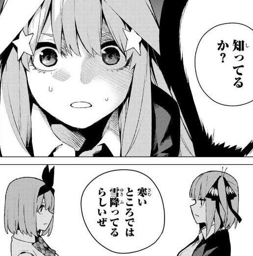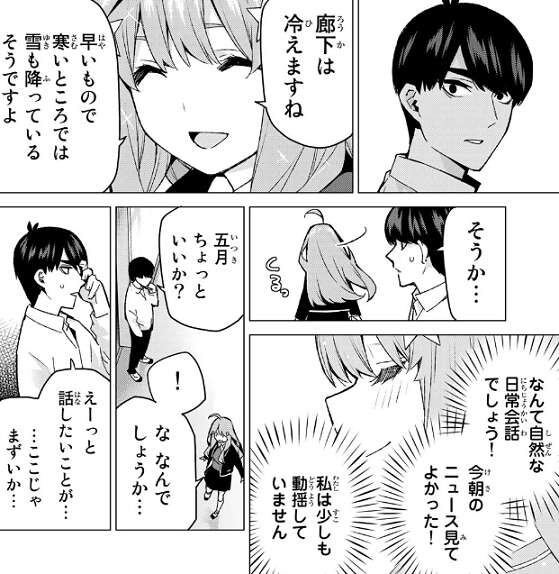 そんな冷静に見える風太郎が五月に話した話題もやっぱり、寒いところでは雪が降っているらしいというお天気ニュースの話でした。風太郎自身も動揺しているようですが、五月も風太郎に驚いています。