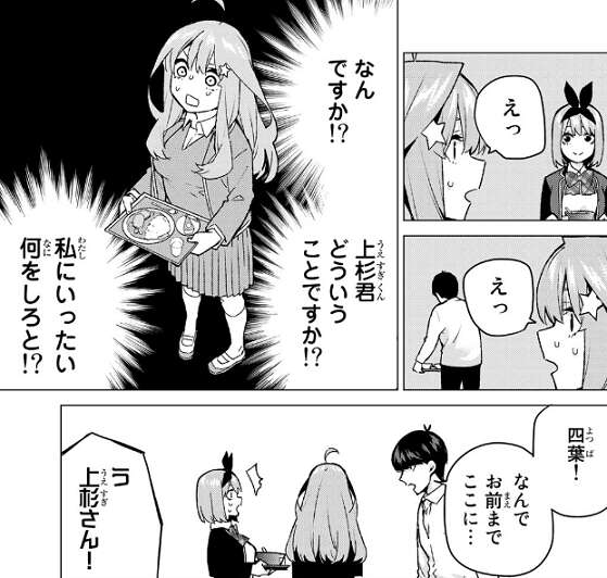 さらに二乃も現れて、二乃、四葉、五月、風太郎と四人が一緒になってしまいます。どうやら四葉が二乃を話があると誘って、お昼を一緒に食べようとしていたようです。