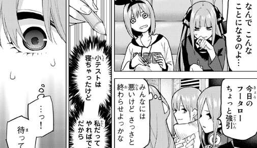 先週、風太郎の小学生時代の思い出と写真の女の子の正体が分かりそうでしたが、結局五つ子達のアホさ故に分からずじまいになってしまいました。「お前らみたいな馬鹿があの子のはずねーわ」と勉強をみっちりふくしゅうしますが、五月?からは「わざと間違えている?」とかまかけられていますね。