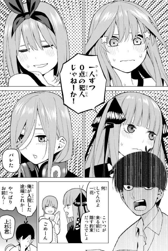 その後、五つ子の答案を見ると全員0点の犯人です。風太郎は自分が入院した途端、こうなったことを愕然とします。