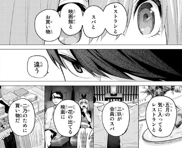 一花と三玖の誘いを断ったうえで、四葉とデートしているので、見つかると修羅場?になってしまいそう。