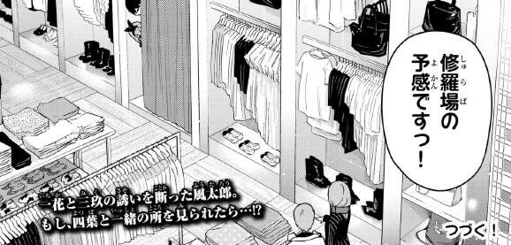しかし一花と三玖の買い物現場に遭遇してしまいます。内容的に、風太郎への買い物のような気が。。。
