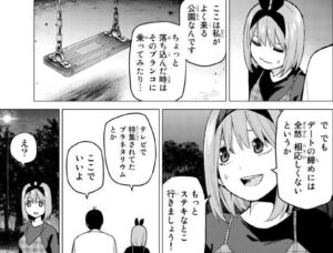 前回からの四葉とのデート回、終了ですが目をつむっていたとはいえ、風太郎の前で着替えるとは四葉も意外と大胆です。公園でも風太郎といい感じになっていました。四葉の個別回は貴重なので、すごく楽しめました。