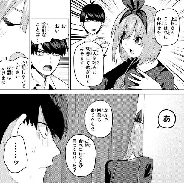 自信満々で一花と三玖を誘導して遠ざけると言う四葉ですが、速攻でばれてしまいいよいよ絶体絶命です。