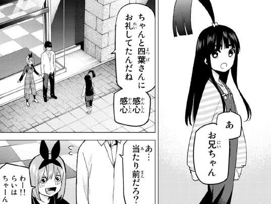 何とか試着室から脱出して一花と三玖に見つからずに、店から脱出できました。が、今度はらいはに出会ってしまいます。
