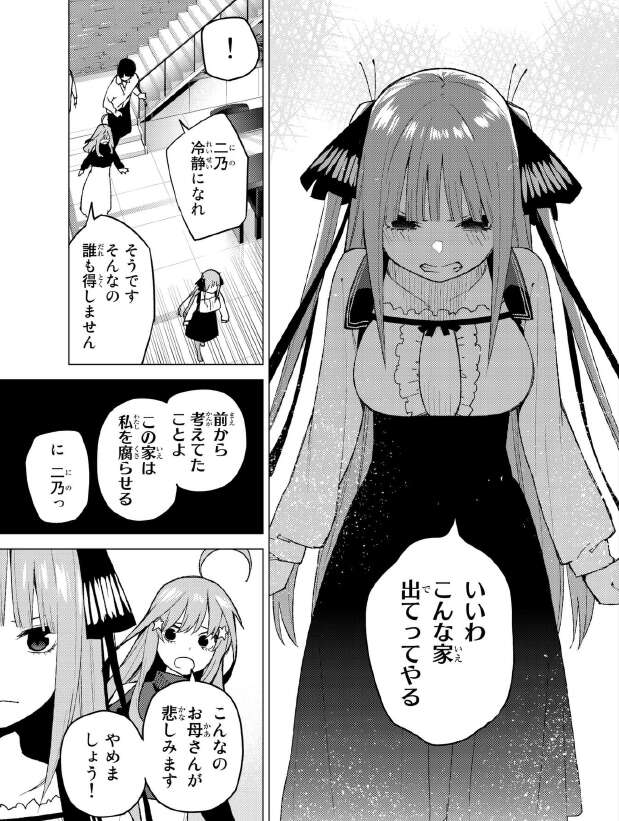 二乃に部屋から追い出されそうになる風太郎は、二乃に誰よりも五つ子とあの家が好きだったはずだと言いますが、二乃からこうなったのは全部風太郎のせいだと責められます。「あんななんて来なければよかったのに」とまで二乃に言われてしまいます。