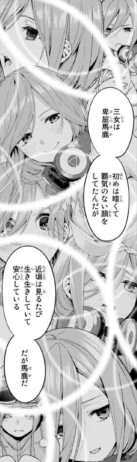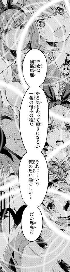 池から上がったもののずぶ濡れの風太郎は偶然、四葉と会います。四葉は部活の手伝いで一緒にランニングしているようです。四葉は試験勉強をしたがっているようですが、大学受験がある先輩も練習に参加している事を言われると、あっさりと諦めてしまいます。四葉、押しに弱すぎます。結局そのまま練習の続きで走っていてしまう四葉を、風太郎は引き留められませんでした。