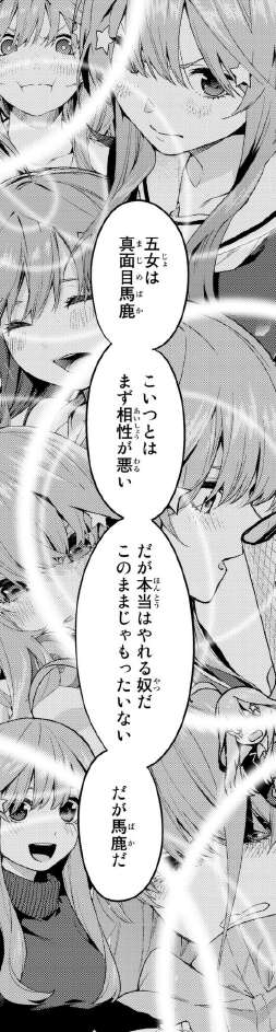 五つ子だという事に驚かない事を指摘されて、わざとらしく驚く零奈です。かなり怪しいです、五つ子の誰かが変装していそうです。零奈にどんな生徒達か聞かれて、馬鹿ばかりだと答える風太郎です。