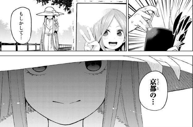 強引にボートに誘われて、ボートを漕がされる風太郎ですが、体力がない風太郎は早くもボートを漕ぐのが限界です。いまだに目の前に京都で会った女の子がいる事が信じられない風太郎。まだ名前も聞いていなかった事を思い出し、名前を聞くと「私は零奈(れな)」と言い、五年ぶりだねと語ります。さらに風太郎が勉強を頑張って学年一位でいる事、今は同級生の五つ子の家庭教師をしている事など、近況まで知っています。