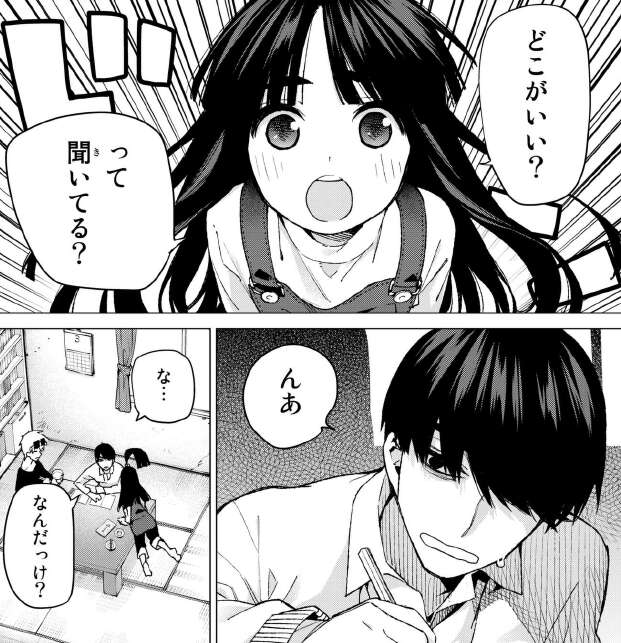 しかし風太郎はらいはや父親の勇也の質問も応えず、勉強に集中しています。しかし実際は二乃の告白に動揺していて、今は全てにおいて集中できていません。見かねたらいはが、風太郎に買い物を頼み、渋々買い物に出かけます。