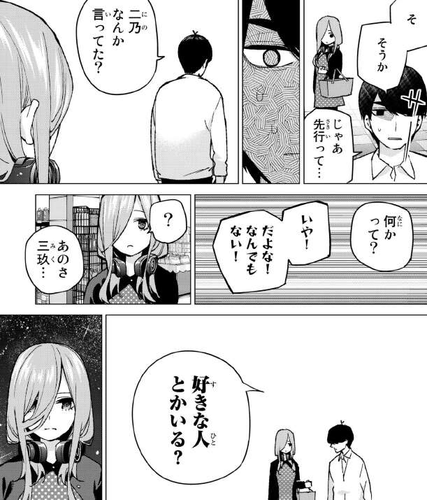 三玖と会話していると二乃の話になった時、風太郎は二乃の事を気にして、三玖に二乃の様子を尋ねます。そして分かりやすく、三玖に好きな人はいるかと質問します。