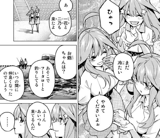 が、結局二乃が近づいてきて風太郎は海に落とす事で、二乃を風太郎から隠します。結局二乃は、夜に抜け出して風太郎の所に会いに行くと言い、一花に手伝ってほしいと言います。五つ子のお父さんがネックなので、もし五つ子のお父さんが来そうになったら足止めして欲しいと言います。