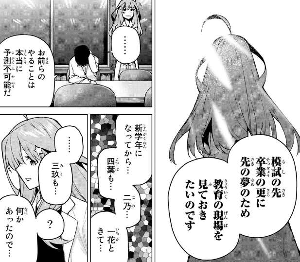 場面変わって、一花たちが帰った後も図書室で一人模試勉強をしている風太郎ですが、かなり疲れている様子です。そこに五月が栄養ドリンクを差し入れに来ます。そして五月は、塾講師をしている下戸という人お手伝いをするバイトを始めると言います。風太郎は俺じゃあ力不足か?と不満そうですが、五月なりに卒業のさらに先の教師になるという夢を見据えての選択だと言います。