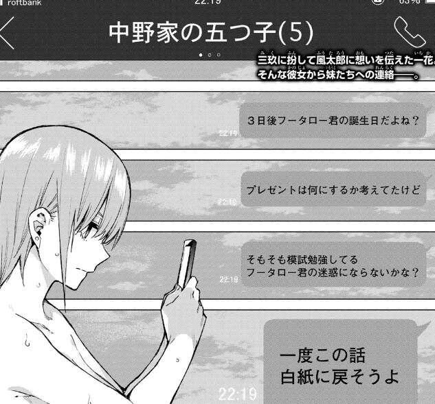 前回、三玖に変装した一花は自分が風太郎の事を好きだと伝えてしまいましたが、一花は妹たちへ風太郎の誕生日でのプレゼントを辞めようと、スマホへメッセージを送信します。