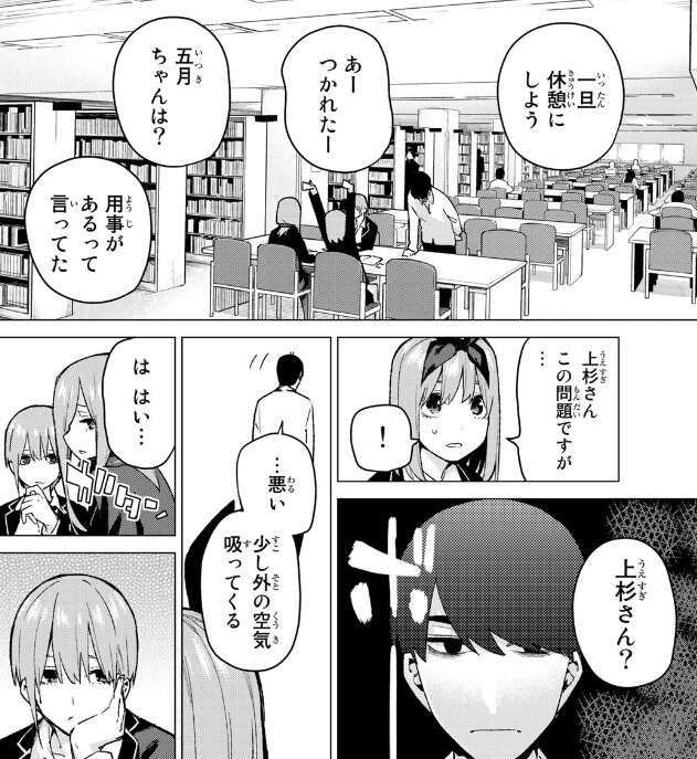 翌日、風太郎と一花たちは図書室で勉強を行っていますが、風太郎は勉強に集中できずぼーっとしてしまっていて、四葉に心配される始末です。風太郎は三玖から一花の事を聞いて、勉強に集中できず、勉強時間を増やして頑張ろうとします。